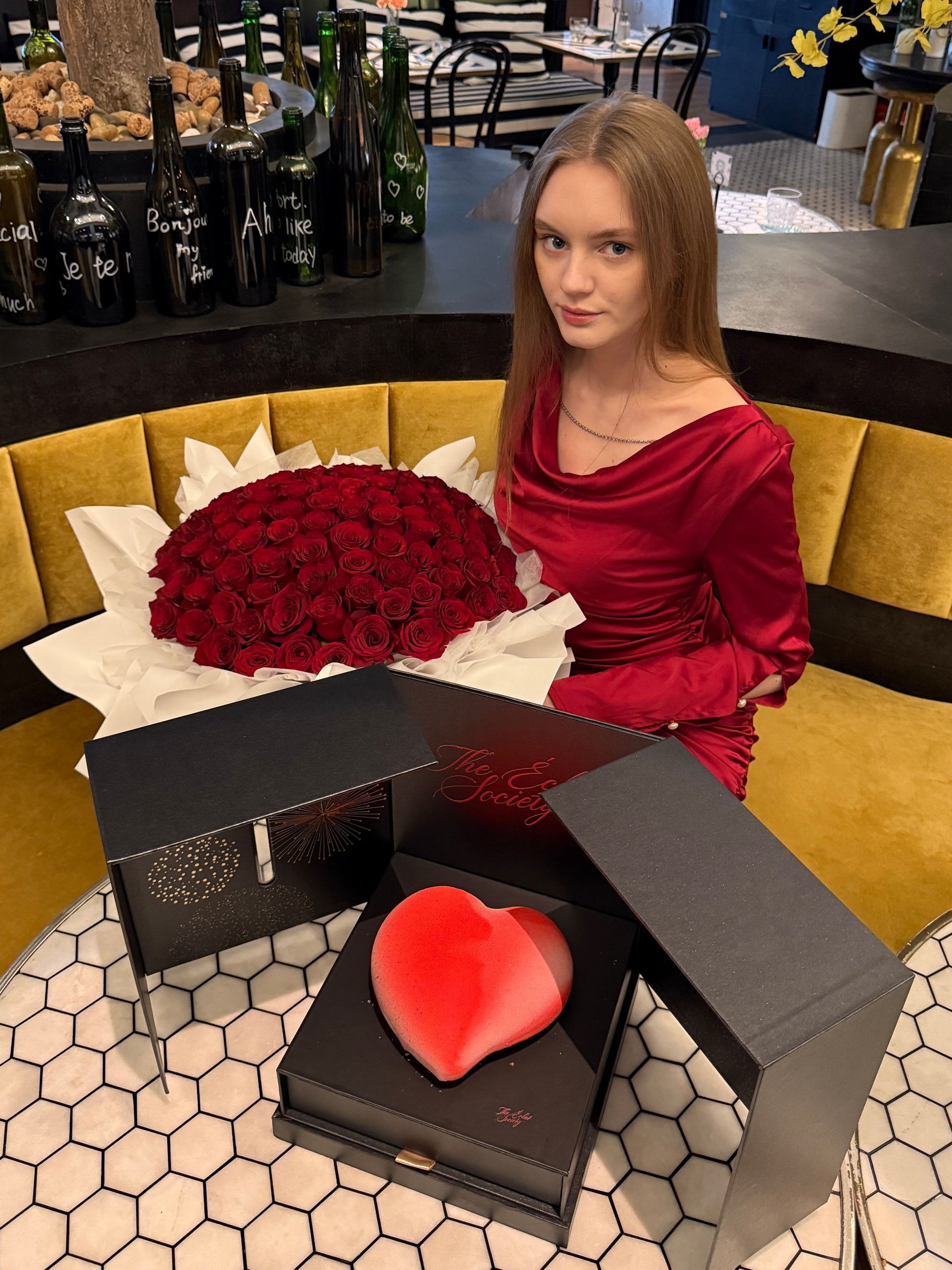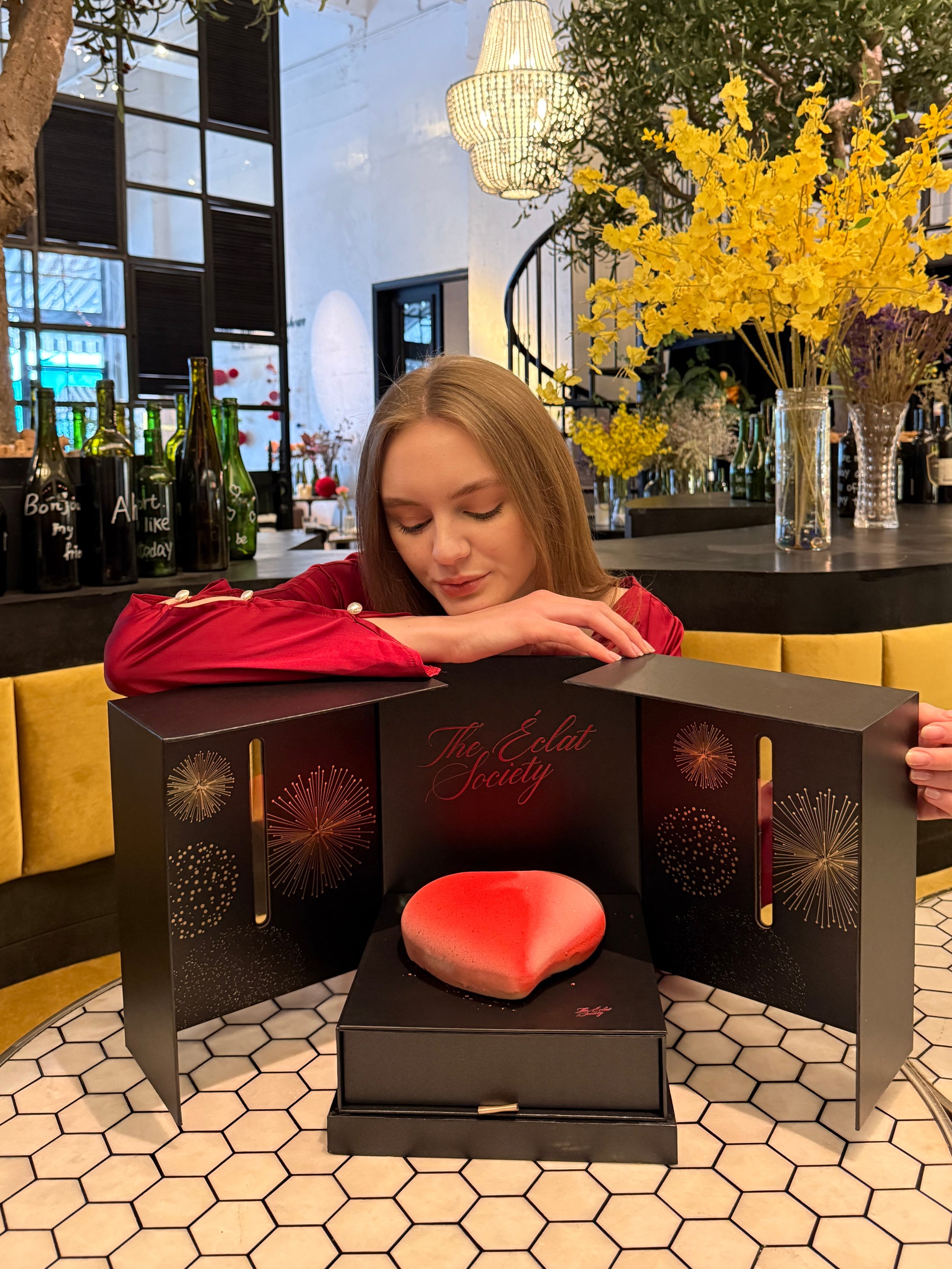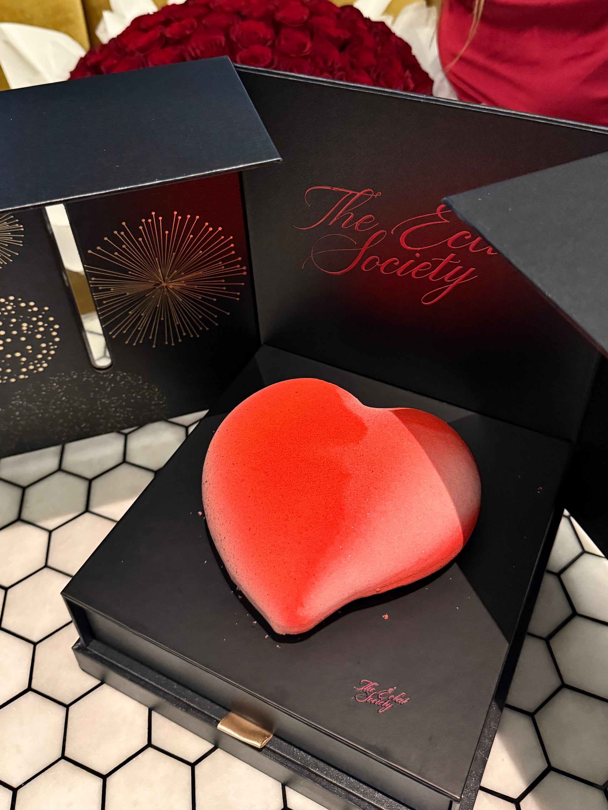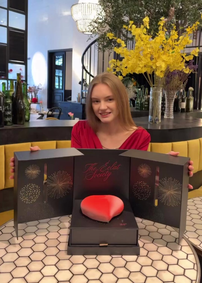 An exquisite heart-shaped creation nestled within our signature noir celebration box. This romantic dessert comes beautifully presented in a matte black tri-fold case adorned with elegant golden firework motifs.